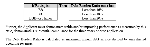 4) The Applicant must obtain an underlying rating from Fitch Ratings, Moody’s Investors Service, or S&P Global Ratings of BB (or equivalent) or higher. The Applicant will provide a copy of the rating report, verifying that the rating is in place for the bonds the UCSFA is being asked to issue. The Applicant must provide a copy of its most recent rating agency presentation upon request of the UCSFA. The UCSFA will analyze the ratings report to note any credit weaknesses outlined therein, and will take such credit weaknesses into account in determining the Applicant’s eligibility for participation in the Program.